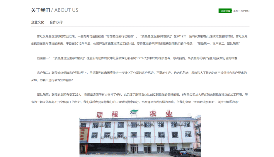 甘肃天水具有盛产花椒的良好地理环境,曹灶义先创立联程农业以来,一直有两句话挂在边“思想要走到行动前沿”、“质量是企业生存的基础”在2012年,所有花椒都是以往模式发展的时候,曹灶义先生已经在思考花椒的未来。巾帼不断努力成为了众多品牌的花椒供应商:周黑鸭,大娘水饺,雨润等。