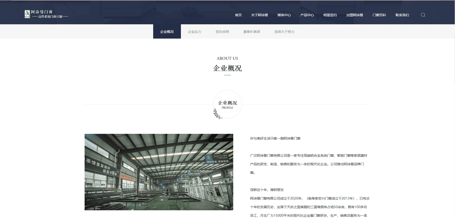 广汉阿诗曼门窗有限公司是一家专注高端铝合金系统门窗、智能门窗等家居建材产品的研发、制造、销售和服务为一体的现代化企业。公司推出阿诗曼品牌门窗。深耕近十年,薄积厚发阿诗曼门窗有限公司成立于2020年,(前身家世兴门窗成立于2013年),已有近十年的发展历史,坐落于天府之国美丽的三星堆拥有占地50余亩,拥有100多名员工,月生厂力15000平米的现代化企业集门窗研发、生产、销售及服务为一体的制造基地。于2021年台湾影视巨星张晨光老师成为阿诗曼门窗形象大使。现公司有近20000㎡的标准化生产车间。公司拥有专业的设计师和研发.售后服务团队,全国精尖的加工设备,公司自成立以来,一直使用国际(知名品牌)铝材。